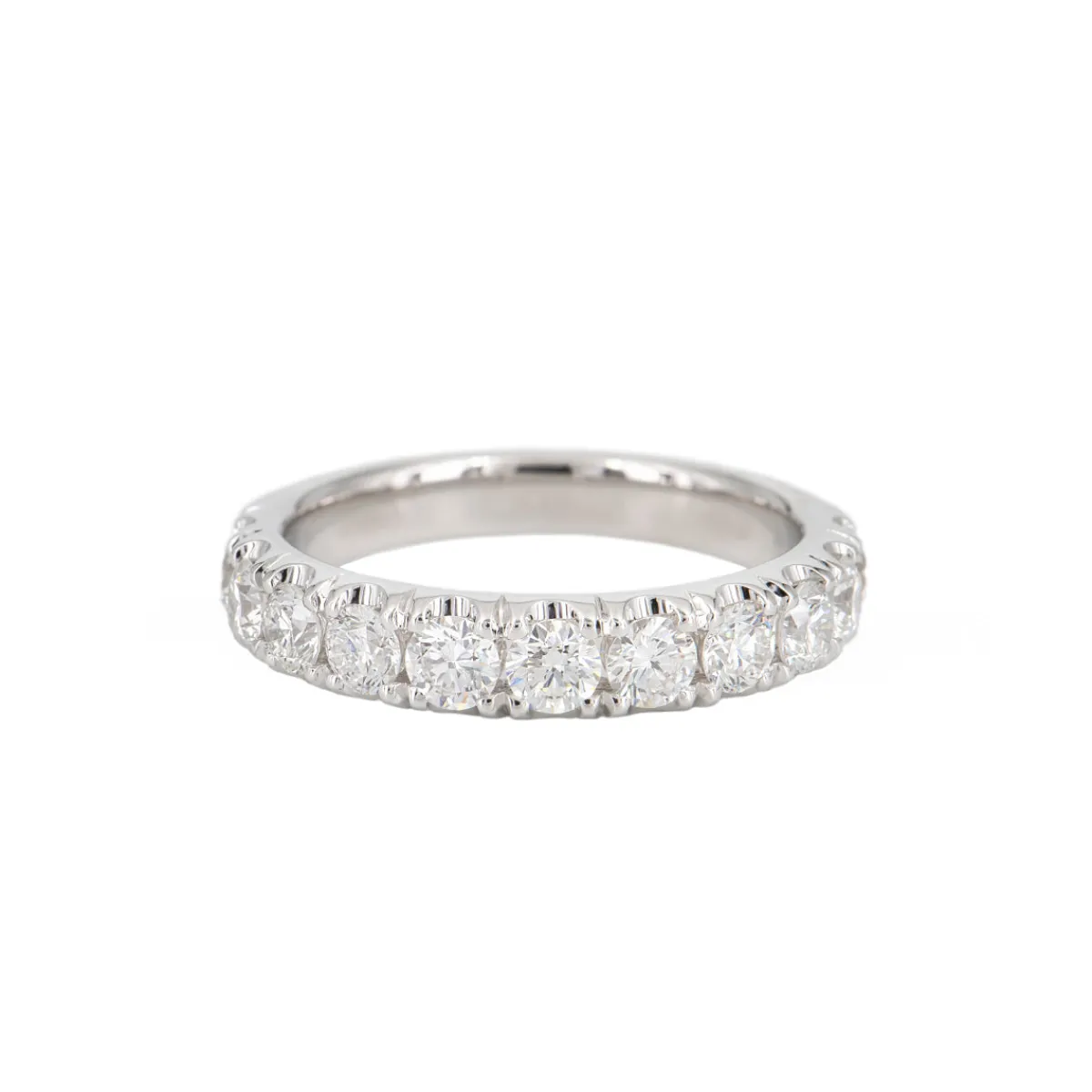 Details:(11) Diamonds, round brilliant, F-G / VS, 1.34 carat total weightButtercup-style set half way, comfort fit18k Wh…