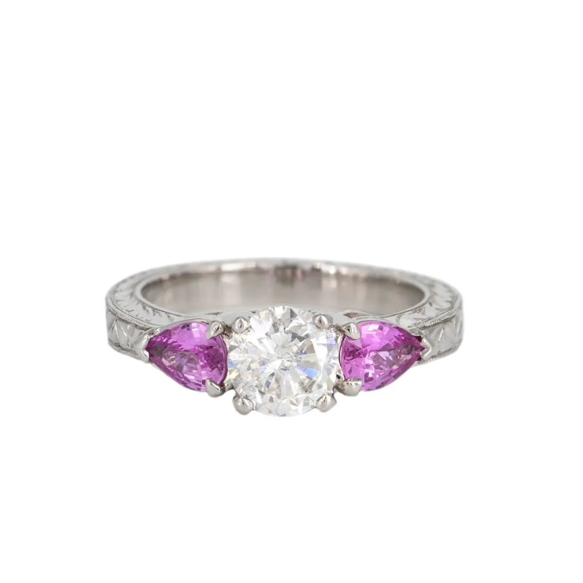 Details:Diamond, 1.0 carat2 Pink Sapphires, pear-shapedPlatinum, entirely hand-engravedOne-of-a-kindRing Size: 5.75