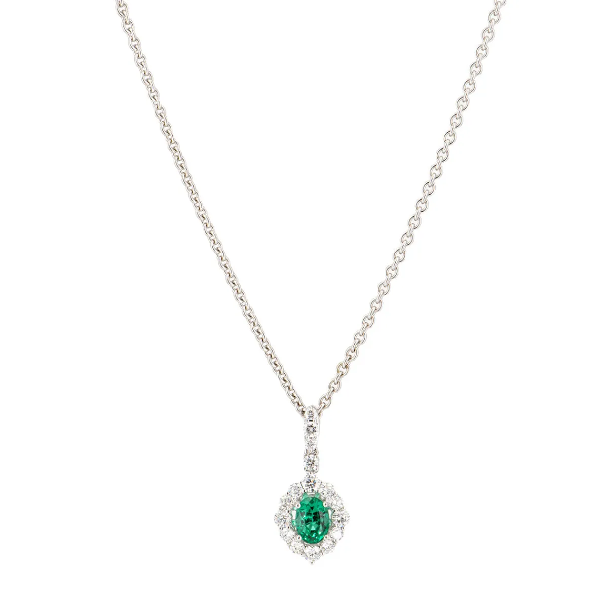 Details:Emerald, 0.88 carat total weight(16) Diamonds, 3/4 carat total weight18k white gold20″ chain included
