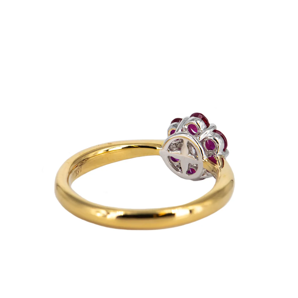 Details:6 Rubies, 5/8 carat total weightDiamond, 0.14 carats18k yellow goldRing Size: 6.5